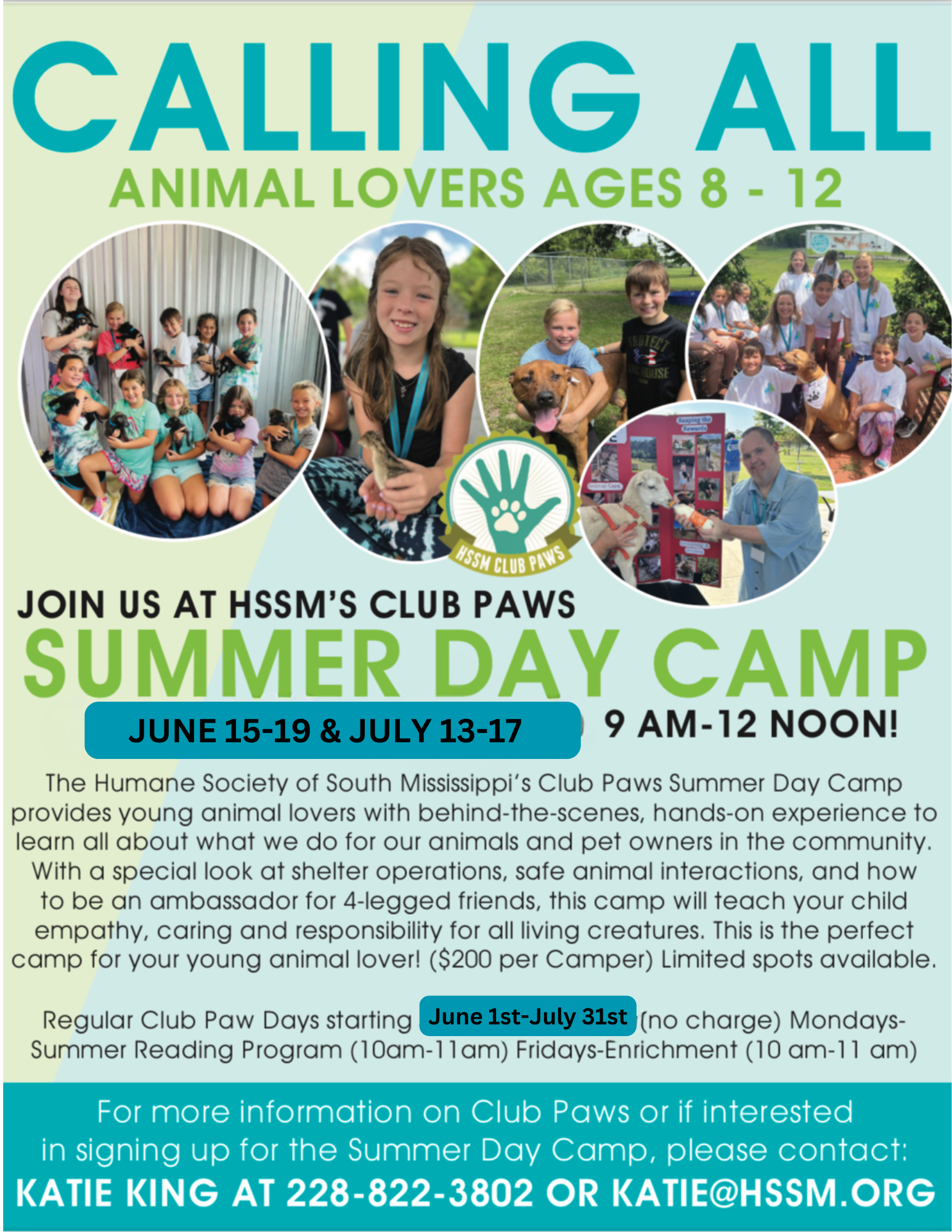 Club Paws Summer Day Camp Session 1 Monday, June 15, 2026 9:00 AM Friday, June 19, 2026 12:00 PM Humane Society of South Mississippi 2615 25th Avenue Gulfport, MS, 39501 United States (map) Google Calendar ICS
